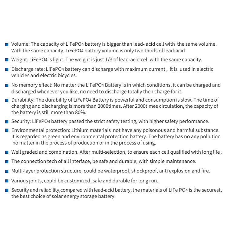 Cycle life: Discharge cycle 2000 times< 1C, Discharge cycle 4000 times< 0.4C